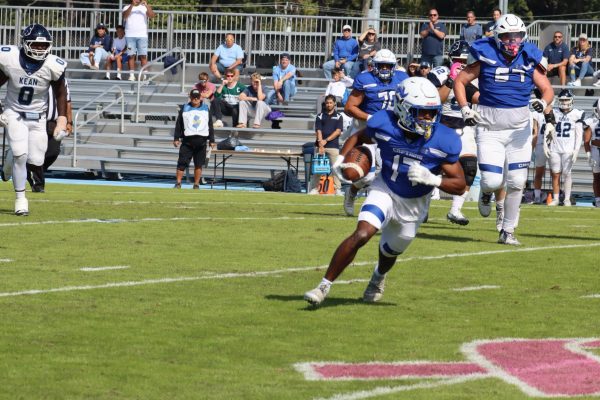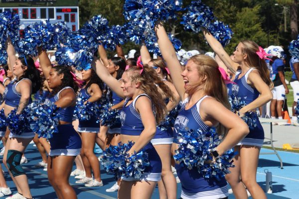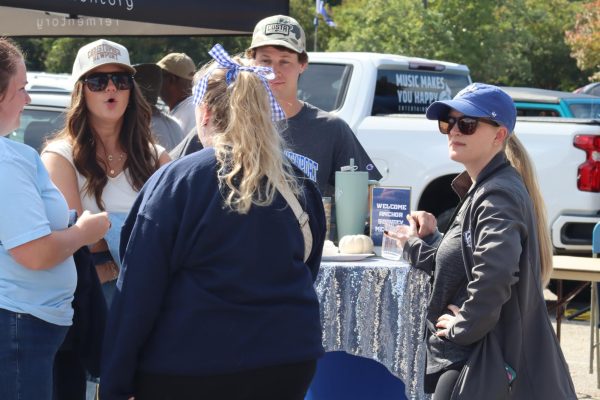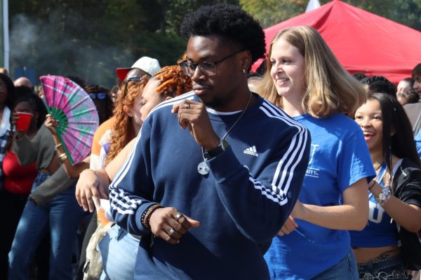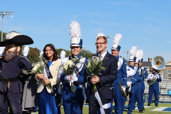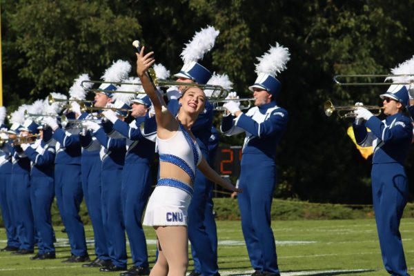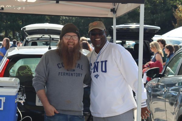 Spirit of CNU winners, Emily Mckenna, Jay Doran and Ryan Arnold pose for a picture with Captain ChrisMarching Captains performing during half-timeCNU Feature Twirler, Colby Topping, performing with the Marching Captains during half-timeWide Reciever, Josh Powell, running the ball down the fieldCNU Cheerleaders hyping up the crowd during the game SaturdayDog wearing a CNU bandana at the tailgate on SaturdayTailgater celebrating homecoming with friendsTailgaters pose for a picture at their tentTailgaters celebrating homecomingTailgaters socializing before the game
